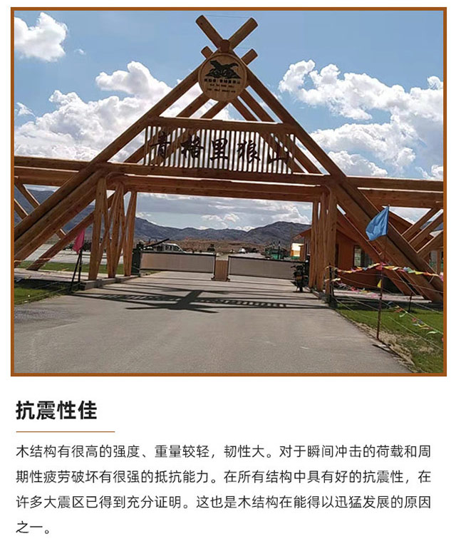 • 木結(jié)構(gòu)有很高的強度、重量較輕,韌性大。對于瞬間沖擊的荷載和周 期性疲勞破壞有很強的抵抗能力。在所有結(jié)構(gòu)中具有好的抗震性,在 許多大震區(qū)已得到充分證明。這也是木結(jié)構(gòu)在能得以迅猛發(fā)展的原因 之一。